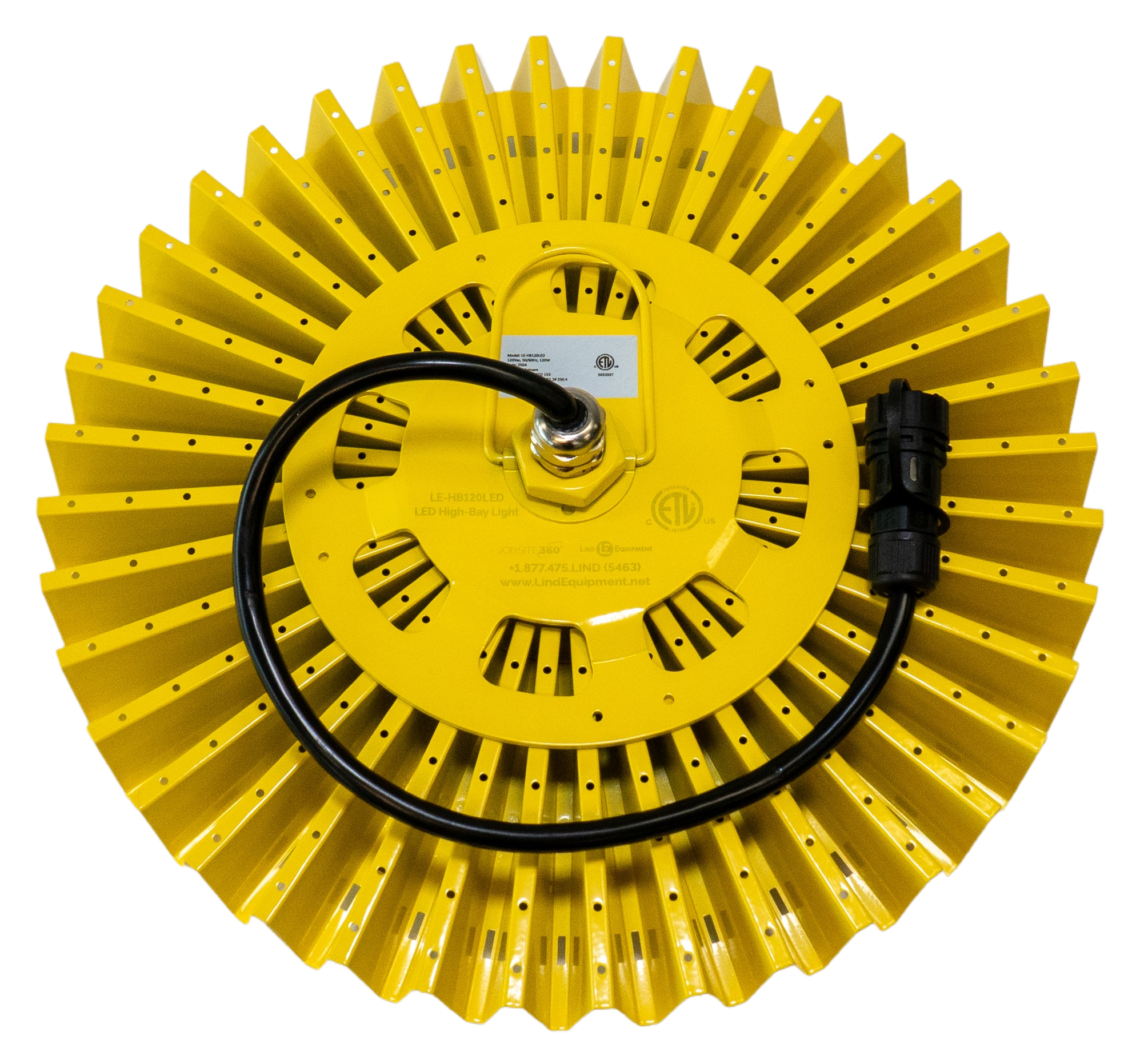 This temporary LED high bay comes with either a standard 3’ cord and plug or Lind’s unique 50’ total cord length triple-outlet daisy chain.